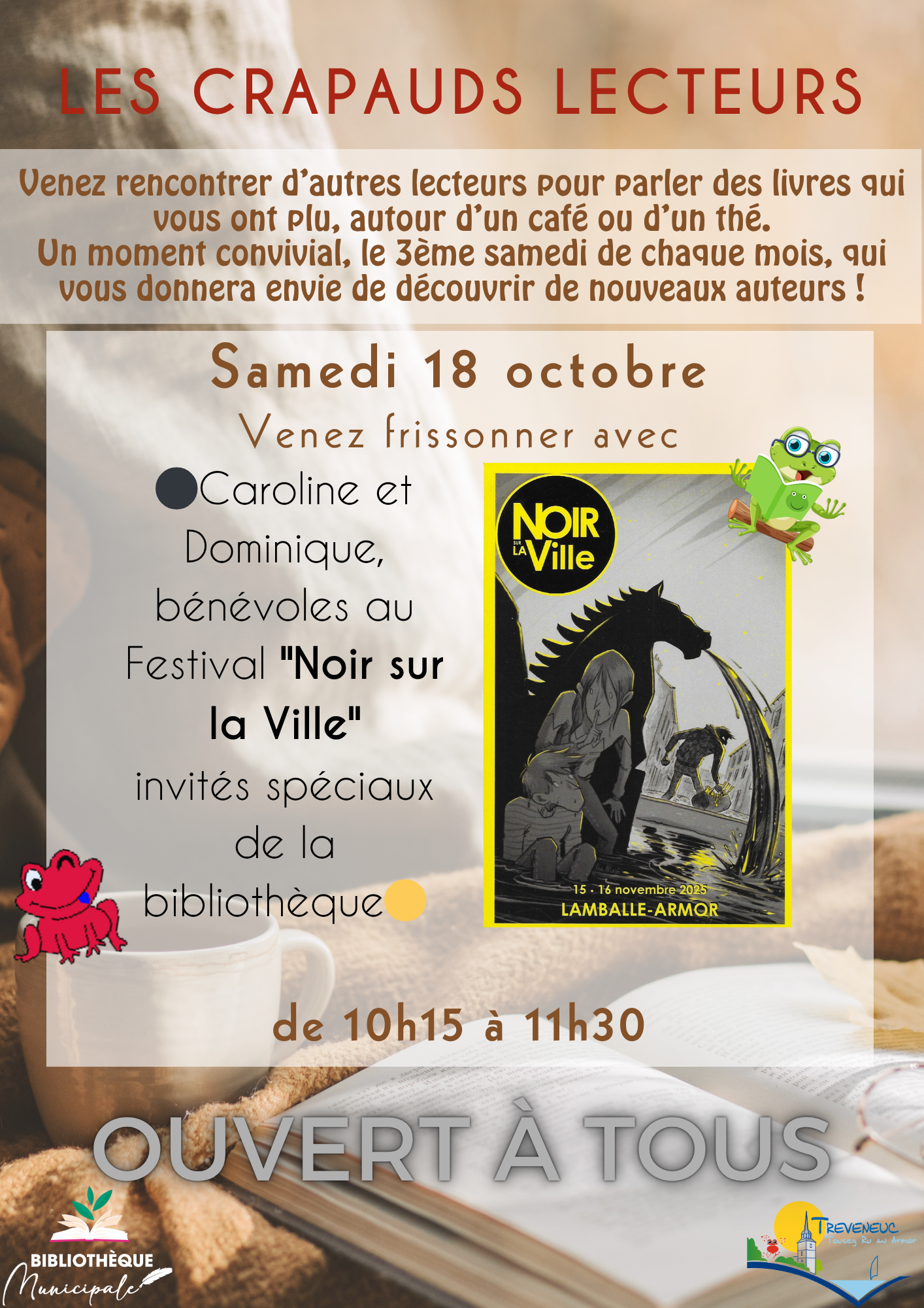 Un rendez-vous convivial pour échanger autour des livres qui vous ont marqué, le 3e samedi de chaque mois, à la bibliothèque de Tréveneuc.☕ Autour d’un café ou d’un thé, venez partager vos coups de cœur et découvrir de nouveaux auteurs !